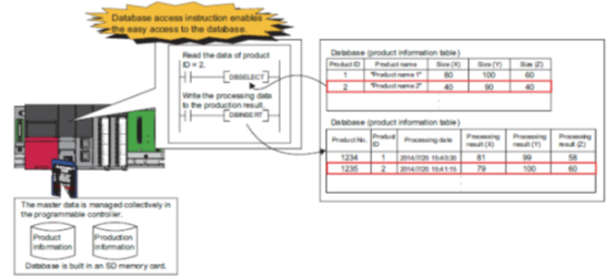 數(shù)據(jù)庫功能將包括產(chǎn)品信息和生產(chǎn)信息在內的列表數(shù)據(jù)在可編程控制器中作為數(shù)據(jù)庫進行管理。