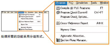 當在梯形圖編輯模式下通過鍵盤輸入指令時,會自動顯示提示的指令并且自動輸入相應(yīng)地址。連接線會根據(jù)光標位置自動插入,使梯形圖編程更加直觀。